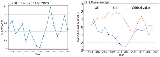 OLR annual mean change and MK analysis. (a) Annual mean change. (b) MK analysis OLR-year average.