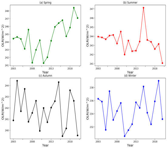 Figure 4 shows the change trend of OLR in each season in China. On the whole, it can be seen that the value of OLR in spring, summer and autumn is higher than that in winter. From Figure 4a, the OLR value in spring as a whole shows a V-shape, with a downward trend from 2003 to 2011. After 2011, the OLR value in spring showed an upward trend and reached the maximum value in 2019 with a value of 246 w/m2. As shown in Figure 4b, the summer OLR value increased from 2003 to 2007, showed a downward trend from 2007 to 2012, gradually increased after 2012 and decreased after 2015, showing a downward trend as a whole, reaching the maximum value in 2015. The value of OLR was about 249 w/m2. From Figure 4c, the OLR value in autumn showed a downward trend from 2004 to 2010. After 2010, it gradually increased and reached the maximum in 2015 and then showed a downward trend. As shown in Figure 4d, the winter OLR value showed a W-shaped change trend from 2003 to 2015 and a V-shaped change after 2015, with low values in 2005, 2010 and 2017 and high values in 2006 and 2015.