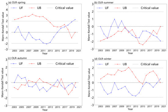 Four Seasons MK test analysis. (a) OLR-spring. (b) OLR-summer. (c) OLR-autumn. (d) OLR-winter.