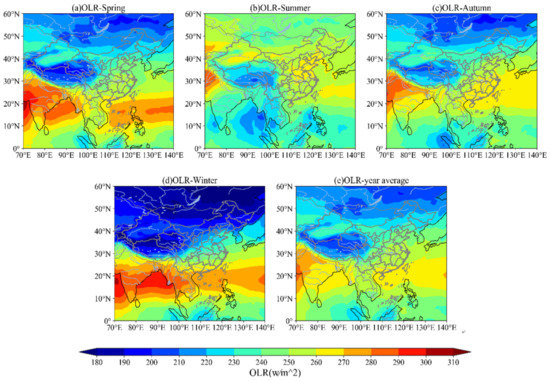 - The spatial distribution of OLR values detected by AIRS varies with latitude. The higher the latitude, the smaller the value. Furthermore, the annual average change high- and low-value area is divided by the north–south dividing line in China, the OLR value of the four seasons is significantly lower in winter than in other seasons, and the change is more obvious in Qinghai-Tibet Plateau and Northeast China.