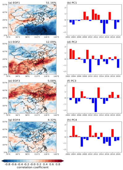 According to Table 1, it is known that the total variance contribution exceeds 70%, which is significant. It can be seen from Figure 7a that the variance contribution of the first EOF1 is 51.16%, far exceeding other modes. Its spatial distribution presents a meridional structure of ‘+, −’; 70°~110° E is positive, and 110°~140° E is negative. From Figure 7b, it can be seen that the time coefficient PC1 shows that the negative value is 11 years, and the positive value is 7 years, indicating that the change in OLR value in the whole 18 years showed a downward trend. But it showed an upward trend before 2013 and showed a significant downward trend after 2013. As shown in Figure 7c, the contribution of the second mode variance of the EOF2 is 12.09%, and it can be seen that the ‘+, −’ changes are divided by the north–south dividing line in China. The south of the dividing line is positive, and the north is negative. Guangdong and Fujian regions showed positive values, and the Qinghai-Tibet Plateau region showed more obvious negative values. From Figure 7d, it can be known from PC2 that the positive value is 8 years, and the negative value is 10 years. After 2009, the overall trend showed a downward trend, and the time coefficient was the lowest in 2010, indicating that the OLR inversion by AIRS in 2010 declined more sharply. As shown in Figure 7e, the variance contribution of the third mode of EOF3 is 5.08%, which can be clearly seen to be a zonal distribution; 30°~55° is a ‘+’ value, and below 30° is a ‘−’ value. From Figure 7f of the PC3 time coefficient, it can be seen that the overall trend is first rising and then falling, and it was rising before 2009, and the most obvious decline in 2012. As show in Figure 7g, the variance contribution of the fourth mode of EOF4 is 4.32%. This variance contribution is small and has no reference value in theory. It can also be seen from EOF4 that it is basically a negative trend in the entire Chinese region. It means that this variance contribution has no reference significance. As show in Figure 7h, it can be seen from the PC4 time coefficient that the positive value is 9 years and that the negative value is 9 years, indicating that the OLR value has not changed as a whole during these 18 years. This also shows that this variance contribution has no reference value.