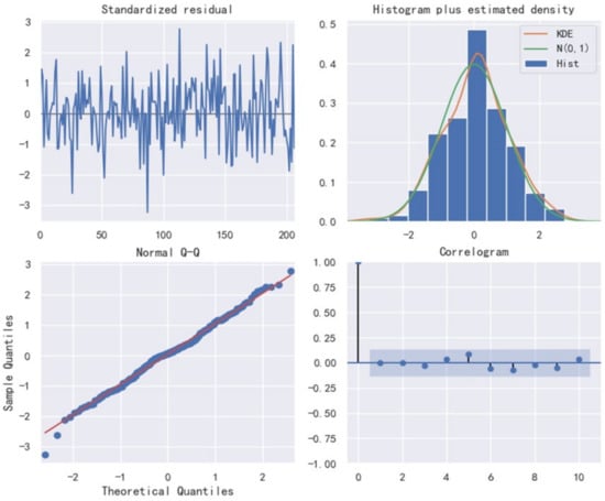 It can be seen from Figure 9 that the prediction results of the OLR data have very good performance results, because it can be seen from the standardized residual diagram. The variation ranges of the standardized residual of the OLR data obtained by the standardized residual processing is within the range of −2–2, and it oscillates around zero, indicating that its effect is better. At the same time, we can see from the histogram plus estimated density that the change of the histogram is mainly concentrated around zero, which is consistent with the change range of the standardized residual, indicating that the change of the standardized residual of the OLR data between −2–2 is correct. It can also be seen from the distribution of the normal distribution and the kernel density estimation (KDE) that the sum of their areas of change is 1, which basically conforms to the function change of the normal distribution, indicating that the effect of SARIMA prediction is good and that it is worthy of reference. After that, we correlate the quantiles of the samples and the quantiles of the theoretical, and we can find that their changes are on a linear line, indicating that their correlation is very high, and the reference of the prediction results that can obtain the OLR data should be high. Finally, we analyze the correlation diagram of the data, and we can find that the range of the correlation points is basically within the light-shaded area, indicating that there is basically no lag process in the change of OLR data, indicating that the prediction results are better. In summary, it can be found that the prediction of OLR data with the SARIMA algorithm should be of great reference value.