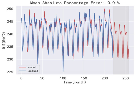 After the model is built, it is necessary to test its residuals. It is mainly necessary to ensure that the residuals of our model are irrelevant. By drawing the residual distribution of the model as shown in Figure 8d, confirming the low correlation between time-series residual and its own lag version by residual autocorrelation. It can be seen that our model produces a satisfactory fit that can help us better understand time series data and predict future values. Finally, the trend of OLR in the next 36 months is obtained through this model, as shown in Figure 10. The abscissa represents the month, and the ordinate represents the values of OLR. It was found that the OLR value showed a decreasing trend, and the error under the condition of percentage error is 0.01%, and the accuracy is very high. It is indicating that the accuracy under the condition of percentage error is extremely high, which can reach close to 99%. It is of great reference value to study the effects of OLR on cloud cover, sea surface temperature and precipitation.