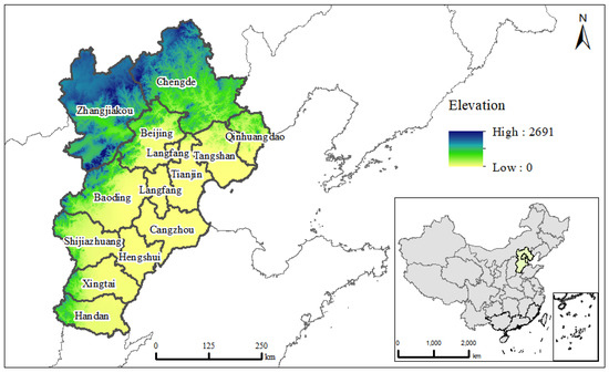 The Beijing–Tianjin–Hebei urban agglomeration (BTHUA) lies in the center of China’s Circum–Bohai–Sea Region, with a population of 109.8 million in 2019. It covers 134,735 square kilometers, accounting for 7.79% of China’s population and 1.9% of China’s territory. In 2019, the BTHUA produced 8447 billion Yuan of GDP, accounting for 8.56% of the national GDP and ranking third among China’s 20 urban agglomerations. Its GDP per capita increased to 77,000 Yuan in 2019. The urbanization of BTHUA reached 62.13%, higher than the average national rate. The BTHUA is usually administratively divided into three distinct regions: Beijing, Tianjin, and Hebei, which include the cities of Shijiazhuang, Baoding, Langfang, Cangzhou, Qinhuangdao, Tangshan, Zhangjiakou, and Chengde. The spatial range data for this studied region is obtained from China National Natural Resources Department Standard Map Service System Pipe Network (http://bzdt.ch.mnr.gov.cn/, accessed on 5 January 2022) (Figure 1).