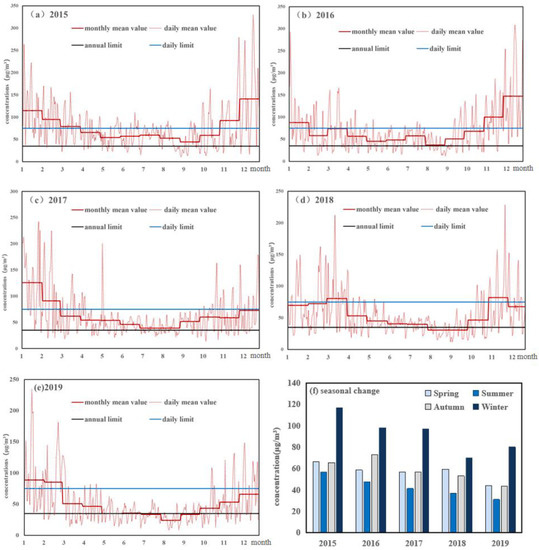 The highest value of PM2.5, with an average value exceeding 92 μg/m3, appeared in winter when centralized heating was ongoing. The average value for the winter season was 116.9 μg/m3 in 2015, whereas after that year, there was a clear decline that became more profound in 2018 with the lowest value, followed by a slight increase in 2019, with an average value of around 80 μg/m3. Autumn and spring ranked second and third with mean values of 58.4 μg/m3 and 57.0 μg/m3, respectively. The lowest concentrations occurred in summer, with an average value of 42.7 μg/m3. Notably, none of the average seasonal values met the Ambient Air Quality Standards (Figure 2f).