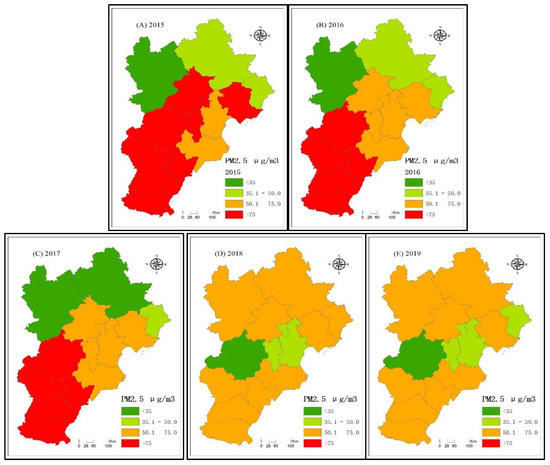 Spatial distribution of PM2.5 concentrations in the Beijing–Tianjin–Hebei urban agglomeration from 2015 to 2019.