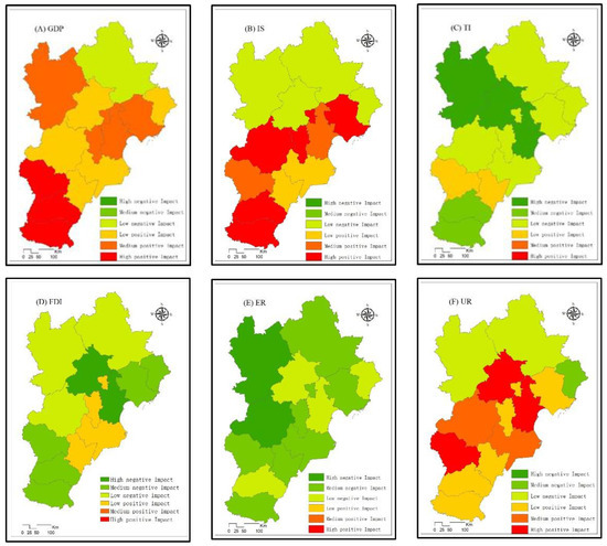 About 84.62% of the area in the BTHUA was characterized by negative correlation coefficients between the technology innovation factor and PM2.5 concentrations. The total effect of foreign direct investment on PM2.5 concentrations is also proven to be negative, with a regression coefficient of 76.92%, the reason for which may be interpreted by the pollution halo hypothesis. The environmental regulation factor in the BTHUA demonstrated a distinct negative correlation with PM2.5 concentrations, which was consistent with both initial predictions and common sense.