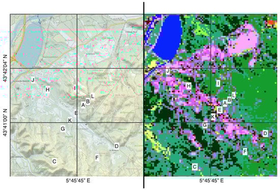 On the (left) is a map of the Cadarache Valley and on the (right) is the equivalent land-use map. Each contour level represents a 20 m change in elevation. On the land-use map, green shades indicate vegetation, pink shades indicate buildings and roads, and blue indicates water. The letters show the LEMS stations, which are described in Section 3. The map on the left is modified, and the original is from https://www.geoportail.gouv.fr/carte, accessed on 9 October 2021. The land-use map on the right is modified, and the original is from https://theia.cnes.fr, accessed on 9 October 2021.