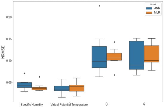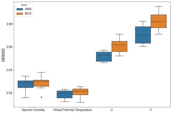 Many interesting points of discussion resulted from this analysis. Figure 3 and Figure 4 show that for both test periods, the mean NRMSE of the MLR predictions was close to the mean NRMSE of the ANN predictions. The virtual potential temperature also displayed the lowest prediction error, while the wind components had the highest prediction error. Interestingly, the prediction of the V component of the wind velocity vector had a higher inter-quartile range than the U component. It appears that for all variables, except for specific humidity during the thermally driven test period, the ANN has a better mean prediction than the MLR, though not by much. Finally, it is important to note that several of the prediction sets have outliers, which are defined as any value that is outside 1.5 × IQR, where IQR is the inter-quartile range.