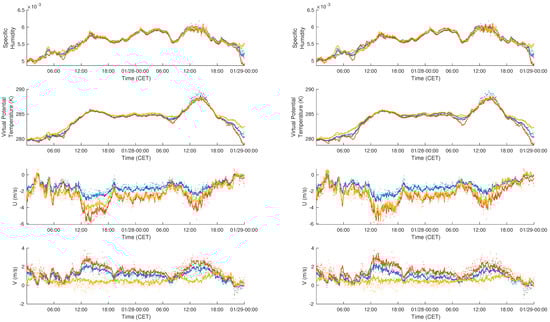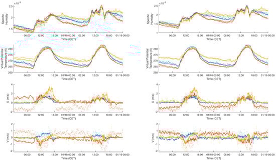 A visualization of the flows for a single time within both periods can be seen in Figure 7. The information presented in Figure 7 is also in Figure 5 and Figure 6. Furthermore, scatter plots for the 15 January 2017–20 January 2017 period for both models when predicting virtual potential temperatures are shown in Appendix B.