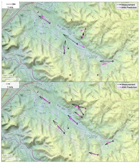 Measured and predicted flow visualization for a single time step in the respective period. The LEMS locations are marked by bold letters. LEMS I, J, and K do not show arrows because they were used for the training data, and LEMS C does not show arrows because it was excluded from this analysis. The (top) half of the figure displays an example of a typical thermally driven flow in the Cadarache Valley (17 January 2017 00:15:00 local standard time), and the (bottom) half of the figure displays an example of typical synoptically-forced flow in the Cadarache Valley (27 January 2017 00:15:00 local time). These snapshots can also be seen in the time series Figure 5 and Figure 6. Map is modified, and the original is from https://www.geoportail.gouv.fr/carte, accessed on 9 October 2021. [institut national de l’information geógraphique et forestieŕe (IGN)].