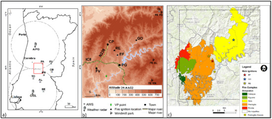 (a) Map of Portugal with the location of the relevant automatic weather (AWS) and radar stations. (b) Zoom in of the fire complex area with the terrain altimetry; important locations (including the accessed video cameras in PG and windmill parks, PE RN, PE AL and PE PS); roads; vertical profile of numerical model (VP) and relevant fire ignitions (EF—Escalos Fundeiros, RE—Regadas and GO—Góis). The square in (a) marks the zoomed in area of (b). (c) Map of the complex of fires of Pedrógão Grande. The square in (c) matches the zoomed in area of (b).