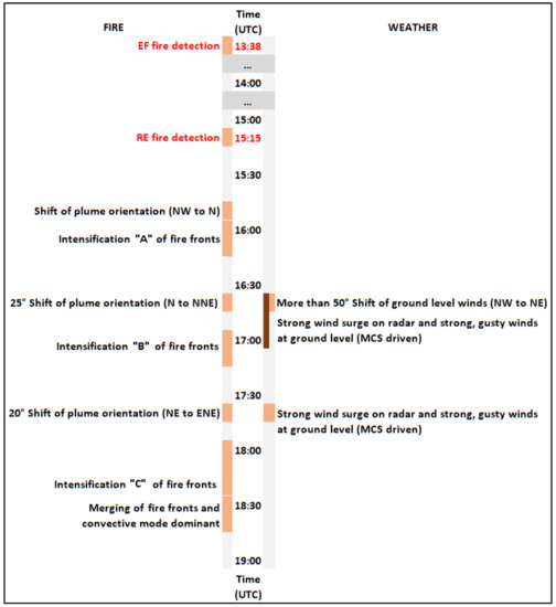 In order to facilitate the follow up of the evolution that occurred during the complex influence of the MCS low-level induced flows over the fires, a timeline was organised (Figure 2). The more relevant events of the fire activity and changes in the low-level flows driven by the MCS are indicated in the diagram. All times are referenced as Coordinated Universal Time (UTC).