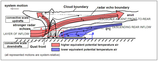 The Global Atmospheric Research Program Atlantic Tropical Experiment (GATE, 1974) prolific research activity resulted in increased knowledge about flows and thermodynamics in MCS. It became commonly accepted that the different types assumed by MCS, both linear and noncanonical convective systems [15,16,17], were strongly dependent on the balance between the environmental vertical wind shear and the storm motion [18,19,20,21,22]. It was also found that the environmental wind shear was related to several scales of flows that were organised in all those systems. On one hand, there are the convective-scale updrafts–downdrafts associated with each individual convective cell. Within this region of deeper convection, the upward air motions are much stronger than the fall velocities of hydrometeors [23]. On the other hand, there is a larger-scale overturning flow. This flow is formed by two limbs, one of them is a front-to-rear (FTR) deep layer inflow, organised as a sloping mesoscale updraft, and the other is a rear-to-front (RTF) mid-level inflow descending below the mesoscale ascent (Figure 3). As the convective-scale updrafts weaken in time and hydrometeor particles are transported to the rear of the system by this sloping updraft that ascends through the area of the more active convection, those particles descend slowly and organise a region of stratiform precipitation [23] to the back of the system. It was shown that the RTF inflow was strengthened if the environmental wind favourably fed air into the mid-levels of the storm [24] and that the direction of the inflow was associated with the system-relative wind direction [25].