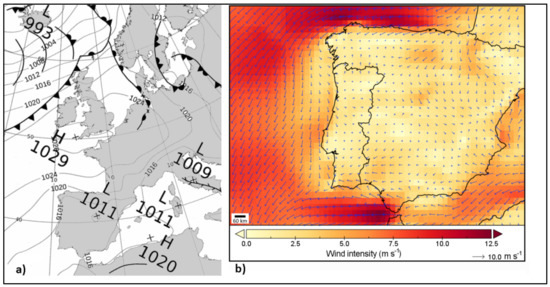 (a) Mean sea-level pressure (solid contours, 4-hPa intervals) over the Northeast Atlantic (adapted from Uk Met Office), and (b) wind intensity and direction (arrows) over the Iberian Peninsula (ERA5 hourly reanalysis) at 12:00 UTC, 17 June 2017.