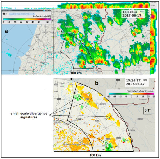 The observations of 15:10–15:16 were considered as representative from the initial stage of the MCS, in which the convective activity formed a broken areal pattern that was identified in the maximum reflectivity product (Figure 5a) to the east of the fire areas. As previously documented, this system developed in an inverted V-type environment prone to downburst activity [44]. Downbursts are strong downdrafts that diverge outward and produce significant outflows at or near the ground level [11,12]. At the leading edge of such outflows, a convergence zone, known as the gust front [55], typically separates warmer and drier environmental air from cooler and moister air originated higher in the storms. This baroclinic zone manifests by turbulent flows with gusty winds.