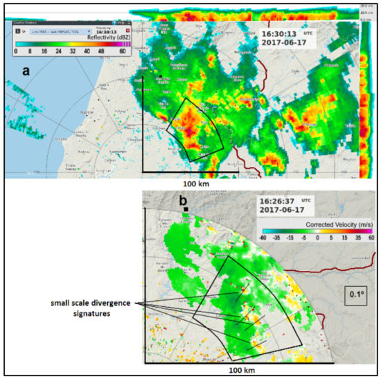 As the system evolved into a more mature stage, deep convection occurred, and high reflectivity cores were observed more extensively at 16:30 (Figure 6a). At that time, many small-scale low-level divergence signatures were detected on Doppler radar, always close to those reflectivity cores (Figure 6a,b). Some of the more active convections occurred in a section of the leading area of the MCS, although some cells were also observed outside that area. No leading convective line was properly defined (Figure 6a,b).