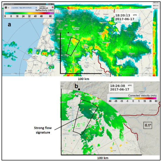 As the system continued to evolve and propagate, it progressively exhibited less convective cores and lower reflectivity. During this dissipation stage, a more homogeneous and moderate reflectivity pattern was observed, coherent with a stratiform-dominated regime that was clear by 18:20 (Figure 7a). At this stage, the low-level Doppler patterns differed substantially from the ones of the mature stage, mainly because a strong flow signature was now observable, still organised at the mesoscale but in a much larger area than the one corresponding to single convective cells (Figure 7b). This signature was observed slightly downwind of modest reflectivity cores in the range 40–42 dBZ.