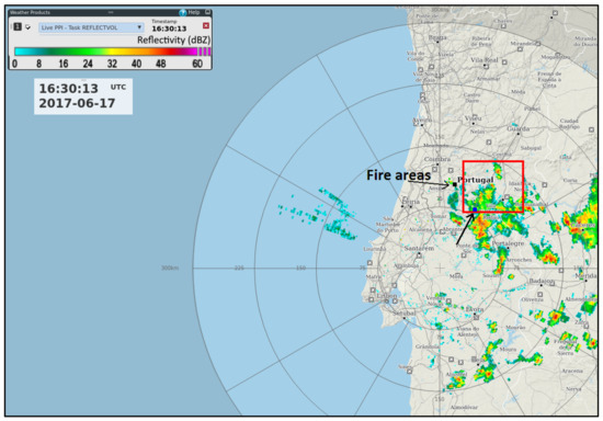 This study focuses on the influence of a weather system in the evolution of two wildfires that started in Pedrógão Grande (PG), Central Portugal in the early afternoon of the 17 June 2017 (Figure 1). During this day, an ensemble of thunderstorms started to organise to the east–southeast of the fire areas. This cloud system was characterised by a horizontal extent of a few hundred kilometres and a life cycle of over 12 h, typical of a mesoscale convective system (MCS) [10]. This MCS developed in a hot and dry atmospheric environment at low levels, where instability existed only from mid-level upwards, favouring the occurrence of active convection in sections of the leading area of the system. A large number of downbursts [11,12] occurred, which were associated with the large magnitude reflectivity cores observed by radar. As a result, strong, low-level diverging flows were generated and their effects extended to ground level, as strong gusty winds were observed to the southeast and south of the fires. These diverging flows did not significantly affect the fires. Meanwhile, the MCS continued to move towards the fire areas, and it started to dissipate as reflectivity cores of relatively lower magnitude were progressively observed by radar, as well as a pattern of more homogeneous reflectivity. No discrete downbursts were generated after the MCS began to dissipate. Instead, strong flows were observed by radar, which were organised over much larger areas (when compared to the scales of single discrete downbursts) and located downwind of modest reflectivity cores. The observations showed that these flows accelerated towards the ground and interacted with the fires, modifying their behaviour, contributing to their merging and the initiation of a very violent fire storm process [13]. For three hours, the fire spread destroyed more than nine thousand hectares and killed 66 people in the Municipality of Pedrógão Grande, making it the worst and deadliest wildfire ever recorded in Portuguese history, as well as one of the most tragic fire events in all of Europe [14].