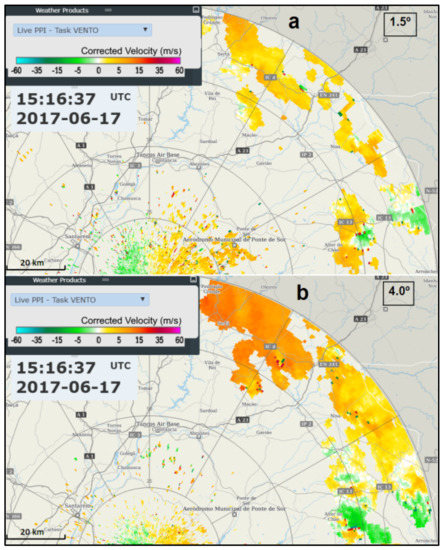 PPI of the storm-relative velocity, 1.5° tilt (a) and 4.0° tilt (b), 15:16 UTC, 17 June 2017, C/CL radar.