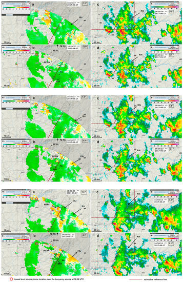 The current knowledge on fire plume mode shows that the multicell type [36,37] is associated with a wind-driven fire phase [38]. In this case, the plume is characterised by individual pyroconvective elements that rise and expand due to buoyancy and fire combustion [39] and are transported downwind. On the other hand, the convective type is typical of a plume-dominated fire phase [38], characterised by a vertically orientated updraft driven by buoyancy, when buoyancy forces overcome the environmental winds [40]. Recent studies have shown that individual elements can be monitored downstream by the radar if high temporal resolution scanning is available [13,41]. This was not the case for the setting of the current study, but still, radar data were available every 5 min for the five lowest tilts of reflectivity scans and every 10 min for the overall volumetric scan. The horizontal distance between the maximum echo top of the plume and the low-level pyroconvective element located close to the buoyancy source was determined to classify the plume mode. To the authors’ knowledge, there are no universal quantitative criteria to classify plume mode on radar. In this study, whenever the horizontal distance between the top of the plume location and the pyroconvective element identified close to the buoyancy source was <6 km, the plume was deemed to be of a convective type.