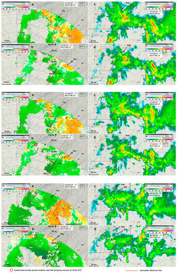 After the merging of the two fires and the consequent firestorm, a period of more than 1.5 h followed during which the plume top was always observed on radar above 8000 m a.m.s.l. and even above 12,000 m (19:30), probably above the tropopause (Figure 14). During this period the magnitude of the low-level reflectivity close to the updraft source was always high in the context of a wildfire [67] reaching a maximum of 29 dBZ by 20:00 (Figure 14). For the vast majority of the time, the plume was of a convective type, nearly vertically stacked (Figure 14).