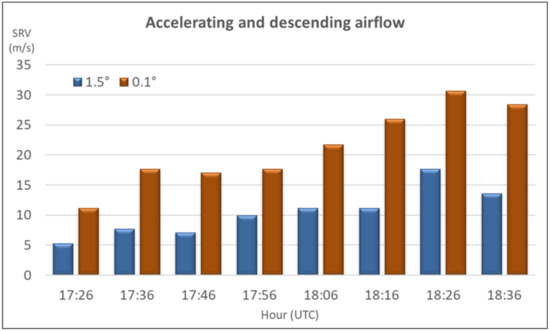By 17:26 an inbound SRV pattern similar to those that were observed earlier, became visible in the higher elevation as an apex of incoming velocities among the outgoing flows. This signature was considered another surge of the RIJ at those levels (2700 m a.g.l.) (Figure S12a). A maximum inbound wind (11.2 m/s) in the lower tilt was roughly aligned and downwind of the apex of this pattern (Figure S12b). At that time a RIN signature was identified on both tilts (Figure S12c,d), the higher aligned and upwind of the RIJ and the lower upwind of the maximum inbound winds at low levels. Ten minutes later, the area of the RIJ pattern detected on the higher tilt of the scan had expanded, which was a clear sign that the RIJ was developing and being better resolved by radar in its westerly/south–westerly displacement (Figure 12a (top panel)). Its maximum inbound SRV winds increased slightly, and a maximum of 17.7 m/s was observed in the lower tilt, just downwind (southwest) of the apex of the RIJ pattern (Figure 12c (top panel)). Again, a signature of outbound winds (FRJ) was present in the lower tilt and these winds also increased concurrently with the RIJ. The RIN signature continued to be identified on both tilts, located upwind of the RIJ and of the maximum inbound winds (Figure 12b,d (top panel)). At 17:46 the higher tilt revealed an even more prominent RIJ signature and its maximum SRV winds increased, again. A maximum inbound wind (17.1 m/s) that was identified in the lower tilt was located, again, downwind of the apex of the RIJ pattern observed above (Figure 12g (middle panel)). The FRJ continued to be identified underneath the RIJ. The RIN signature also continued to be visible at both elevations, located upwind of the RIJ (Figure 12f,h (middle panel)) and strongest low-level inbound SRV (Figure 12g (middle panel)). Between 17:36 and 17:46 at the low levels, a displacement to the southwest of the maximum inbound wind pattern was identified (Figure 12c (top panel) versus Figure 12g (middle panel)). This displacement was noticed concurrently to the expansion of the RIJ signature to the southwest and is interpreted as a sign of spatial coherence of the flow observed at two different heights.