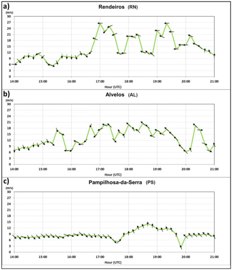 Radar observations revealed that from 16:26 onwards, a front-to-rear flow (FRJ) located beneath the RIJ was observed concurrently with it. Ground observations were coherent with such flow. By 17:50, the PE PS Park started to reveal a southerly flow (Figure 15) and at the same time, the PA AWS (Figure S6), located very close to the PE PS Park, also showed a wind shift to the southern quadrant. Even considering that wind observations at 10 m (AWS) and 60–80 m a.g.l. (windmill parks) may reflect some difference at the same location, their general agreement strengthens the conclusion that only then this location became influenced by the MCS convectively driven flows.