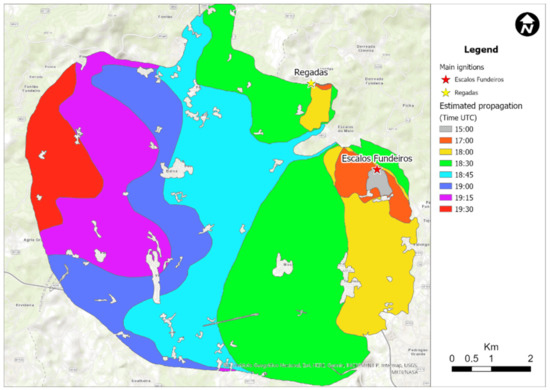 The fire of Pedrógão Grande (PG) resulted from two separate fires that started on the 17 June 2017 near the town of PG. The first ignition occurred at Escalos Fundeiros (EF) at 13:38, and an electric power line was probably the cause [14]. A second ignition attributed to the same cause, but 2.6 km away at Regadas (RE), started at about 15:15 (Figure 1b,c). An intermediate fire ignition, at 13:48, occurred in the Municipality of Góis, less than 20 km away from the PG fires. Other simultaneous fires in the region contributed to dispersing the fire suppression means.