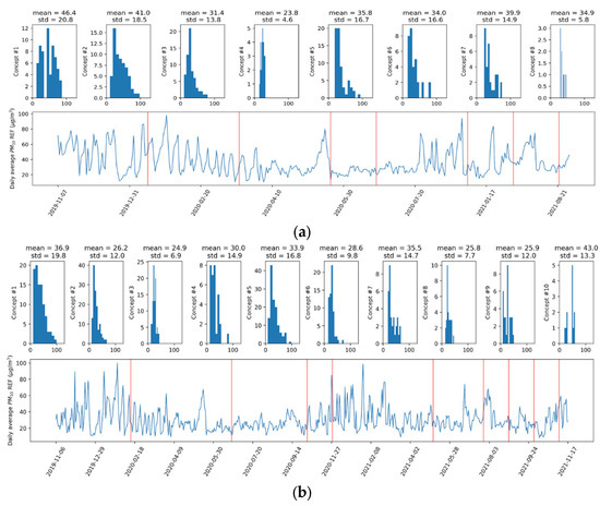 To quantify the concept drift, the reference pollutant measurements were aggregated to meaningful 24 h averages for particles (PM10) and 8 h averages for ozone, and the ADWIN drift detection algorithm was applied. The results are depicted as red vertical in Figure 2 and Figure 3. Furthermore, a set of histograms corresponding to the detected intervals are depicted in a sequential way. The mean and standard deviation are calculated to quantify the changes. Most of the segments are meaningful in detecting changes in the statistics; however, there are cases where it is visibly not a good threshold. Regardless of ADWINs accuracy, the concept drift can also be observed in the distributional changes over time. Each distribution represents the detected concept and their sequence represents the evolution of the concepts in time. An interesting instance is the PM10 time series in Kordelio. The expected distribution resembles concept #1 for winter. Moving forward in time, the distribution shrinks (concept #3 and #4), which is characteristic for the spring–summer periods in Thessaloniki mostly due to reduced domestic heating. In concept #5, that lasts for the whole winter period of 2020–2021, the distribution returns to its original form with similar statistics. Evidently this is caused by seasonality and is related to meteorology; however, from the concept point of view this can be translated to a reoccurring concept drift. As is also indicated from the regression metrics in Section 3.3, the winter concept has clear patterns to model and the metrics agree; however, during the summer the measurements are far noisier with less variance and the models struggle. Ozone on the other hand, shows stable variance except for the winter months where the pollution levels are low, and the noisy pattern problem arises here too. For this case, mostly the mean shifts are observed, which is again related to the meteorology.
