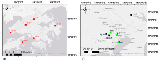The locations of GPS stations in Hong Kong and GPS stations and weather stations in the Tokyo metropolitan area are shown in the map shown in Figure 1. Figure 1a shows the locations in Hong Kong of GPS and meteorological stations, and temperature and GPS data are reported from the same sites. Figure 1b shows the locations of GPS stations (black points) and meteorological stations (green points) in Tokyo.