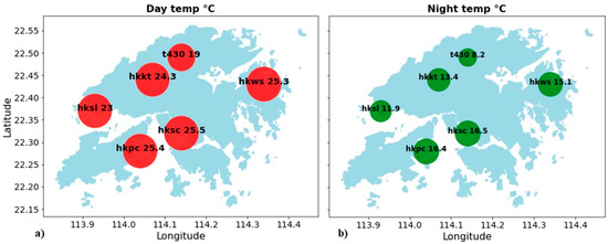 Air temperatures in Hong Kong are higher during the summer and during the day; however, at night is when the UHII is higher. Therefore, the spatial distribution of the temperatures estimated with GPS data, as shown in Figure 2, was calculated with the average temperatures during the day (08:00–20:00 local time (UTC+8) LT) and night (20:00–08:00 LT) during the summer (June–August).
