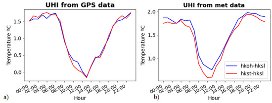 According to the profiles of the AUHI intensity estimated with GPS data and the intensity measured with meteorological data shown in Figure 3, the intensity reaches its maximum value at 06:00 LT, after which the intensity decreases. Clearly, during the morning hours (08:00–20:00 LT), the UHI Intensity profile is different to the profile during night-time (20:00–08:00 LT).