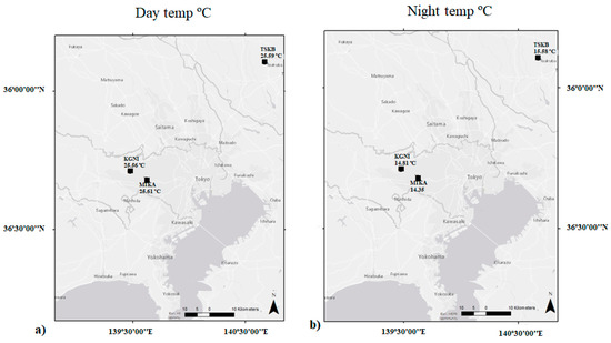(a) Average temperatures in the summer (June to September) during the day (08:00 to 20:00 (UTC+9) local time LT). (b) Average temperatures in the summer during the night (20:00–08:00 LT).