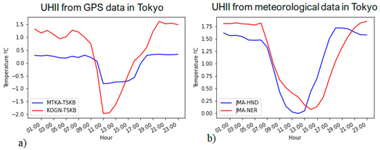 AUHI intensity in Tokyo (a) estimated with GPS data and (b) measured with meteorological data. Local time in Tokyo is UTC+9.