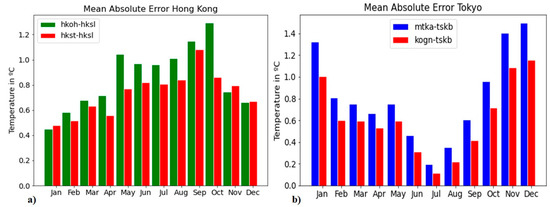 (a) Mean absolute error for data in Hong Kong. (b) Mean absolute error for data in Tokyo.