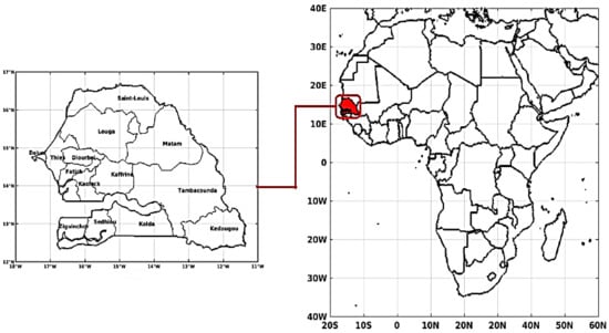 This study focuses on Senegal, located between the latitudes 12°–17° N and the longitudes 18°–11° W (Figure 1). Senegal is the westernmost African country with an estimated 196,712 km2. Senegalese territory is limited to the north by Mauritania, to the east by Mali, and to the south by Guinea Conakry and Guinea Bissau. The Republic of Gambia, which occupies the entire lower course of the river of the same name, constitutes an enclave 25 km wide and nearly 300 km deep within Senegalese territory. Senegal is a country in sub-Saharan Africa with a Sudano-Sahelian climate. The climate is tropical in the south and semi-desert in the north; it is characterized by the alternation of a dry season from November to mid-June and a humid and hot season from mid-June to October. The annual average rainfall follows a decreasing gradient from the south to the north of the country. It goes from 1200 mm in the south to 300 mm in the north, with variations from year to year. The two distinct seasons, known as the wet and dry seasons, result from the interaction of two migrating air masses: the hot, dry tropical continental air mass and the moisture-laden, tropical maritime or equatorial air mass. Malaria is one of the leading public health burdens thanks to the ambient environment created by the uniform high sunshine, high temperatures, and rainfall that characterize the region all year round. The area of study is shown in Figure 1. Table 1 summarizes the different climatic and health datasets used in this study.