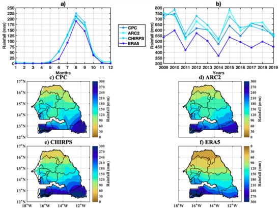 Spatio-temporal variability of rainfall in Senegal from 2009–2019: the annual cycle of rainfall (a), interannual variability of rainfall (b), and spatial distribution of rainfall for CPC (c), ARC2 (d), CHIRPS (e), and ERA5 (f).