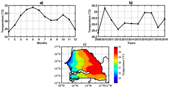 In Figure 4, the spatio-temporal temperature variability of ERA5 has been plotted for the period 2009–2019 in Senegal. Figure 4a shows a bimodal evolution of temperature and temperature peaks in May and October. The first peak coincides with the start of the rainy season, and the second coincides with the end, as found in [33,40,41,42]. Concerning the interannual temperature variation (Figure 4b), 2010 still records the highest value (above 29 °C). The result obtained with the spatial distribution of temperature (Figure 4c) shows an increasing variation from the coastline towards the country’s interior, with the highest temperatures in the eastern part of the country. The lowest temperature values caused by sea breeze effect, are found in Dakar, located at the western part of Senegal.