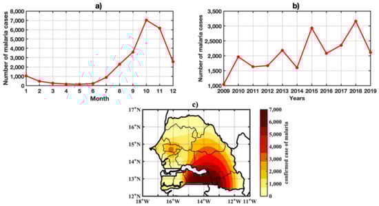 Figure 5a–c represents the annual cycle, interannual variability, and spatial distribution pattern of the malaria surveillance data, i.e., several confirmed malaria cases. As shown in the yearly cycle, malaria cases grow gradually from the dry to the rainy season and decrease toward the end of the year (Figure 5a). The maximum in malaria cases is shown in October due to the large hatching of mosquitoes following the heavy rains in August [16]. Despite the upward trend during this period, malaria transmission has been declining for some years. This decrease in transmission coincides with both a decrease in precipitation and an increase in temperature. A large data set on the risk of malaria transmission in Africa validates both the 25 °C optimum and the decline above 28°C. [12]. The years 2010, 2011, 2016, 2017, and 2019 perfectly show this hypothesis.