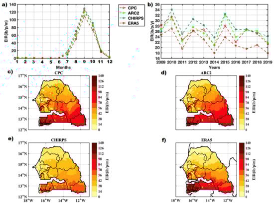 Spatio-temporal variability of the EIR (entomological inoculation rate) in Senegal for the period 2009–2019: annual cycle (a), interannual variability (b), and spatial distribution for CPC (c), ARC2 (d), CHIRPS (e), and ERA5 (f).