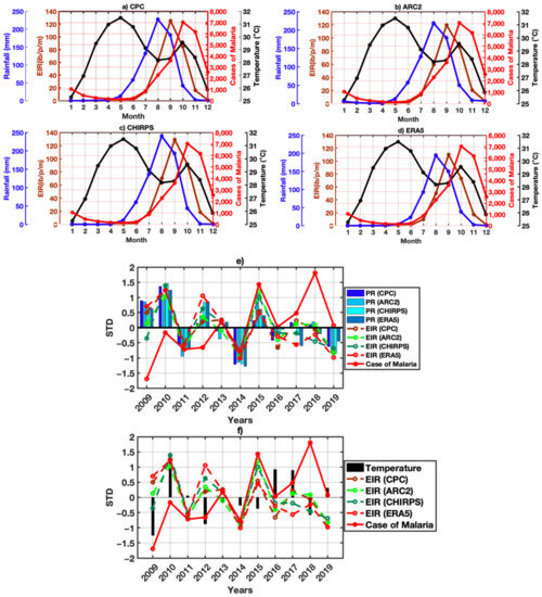 Comparison of the intra- and interannual variability of temperature, rainfall, number of confirmed cases of malaria, and EIR in Senegal from 2009–2019: the annual cycle of CPC (a), ARC2 (b), CHIRPS (c), ERA5 (d), and interannual variability of rainfall (e) and temperature (f).