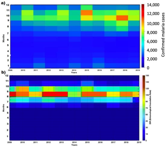 Intra- and interannual variability of malaria cases and simulated malaria parameter (EIR in ib/p/m) in Senegal from 2009–2019: malaria case (a) and EIR (ib/p/m) (b) for ERA5.
