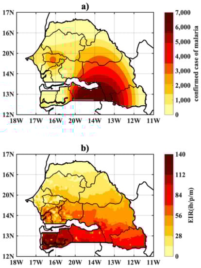 Comparison of the spatial distribution of malaria cases and simulated malaria parameter (EIR in ib/p/m) in Senegal from 2009–2019: malaria case (a) and EIR (ib/p/m) (b) for ERA5.