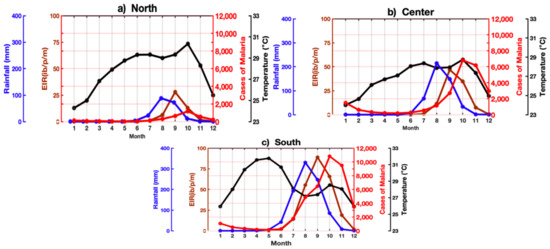 Figure 10 shows the annual cycle of temperature (black line), rainfall (blue line), confirmed cases of malaria (red line), and EIR (brown line) in the three zones: north (Figure 10a), center (Figure 10c) and south (Figure 10c). High malaria data (observed cases and EIR) associated with high climatic parameters (rainfall and temperature) are noticed in the south zone (Figure 10c). Inversely, low malaria data associated with low rainfall are observed in the north zone (Figure 10a). Increasing temperatures in the north zone seem to reduce the activity of Anopheles larvae and thus the transmission of malaria during the rainy season.