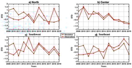Figure 11 compares the interannual variability anomaly for the simulation and observation of agro-climatic zones: the north zone (Figure 11a), central zone (Figure 11b), and south zone (Figure 11c,d). To better see the variability in the south, where southeasterly monsoon flow is associated with rainfall, two zones are considered: the southwest and southeast. The model correctly simulates the trends of observed malaria cases in the central area of Senegal through EIR (Figure 11b). Further, the observed malaria cases in the north and southwest zones are relatively well captured by VECTRI (Figure 11a,c) during the first years of the period. Finally, VECTRI does not accurately simulate the interannual malaria variations over Senegal’s southeast during 2009–2019.