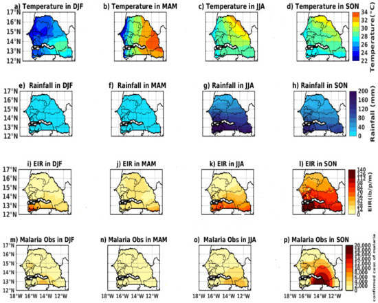 Comparison of the spatial variability between the data of the number of confirmed cases of malaria and EIR in agro-climatic zones in Senegal from 2009–2019: temperature in DJF (a), MAM (b), JJA (c), SON (d); rainfall in DJF (e), MAM (f), JJA (g), SON (h); EIR in DJF (i), MAM (j), JJA (k), SON (l); and malaria cases in DJF (m), MAM (n), JJA (o), SON (p).