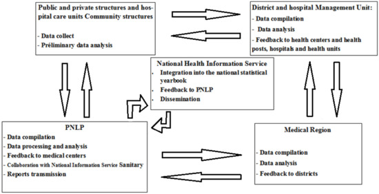 Description of the National Malaria Control Program (PNLP) network covering the public health centers in Senegal: The various steps consist of collecting and processing the data, analyzing the results, and disseminating governmental reports.