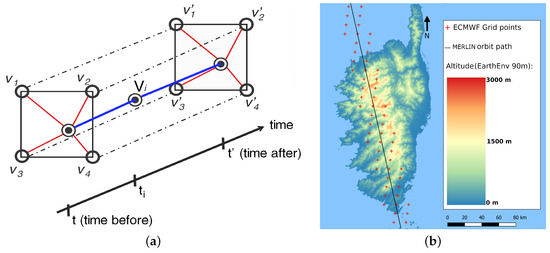 (a) Schematic of time and horizontal interpolations. An observation is made at time between times t and t’ corresponding to the times when meteorological data are available. , , , are the value of a parameter at four points around the target point at time t and , , , are the value at the same points at time t’. is the interpolated value at the target point at time . (b) For the Corsica region, on a representation of the topography from the EarthEnv DEM [15], the points where meteorological data are available in the ECMWF database are in red and the target points that are part of the MERLIN ground track are in black.