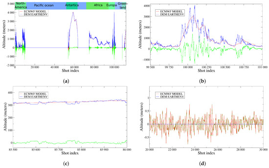 Comparison between the meteorological model topography (red) and the numerical elevation model used [15] (blue). The difference is in green. (a) For a complete orbit starting north of Canada, descending over the Pacific to Antarctica, ascending over Africa and the Alps, before ending over Greenland. The shot index corresponds to the position in the simulated orbit. (b) A zoom on the Alps region where the difference sometimes exceeds 1 km. (c) A zoom on a flat area, the differences are about 20 m. (d) Over the sea, the differences are not zero because of the Gibbs phenomenon affecting the model topography, but they are less than 1 m.